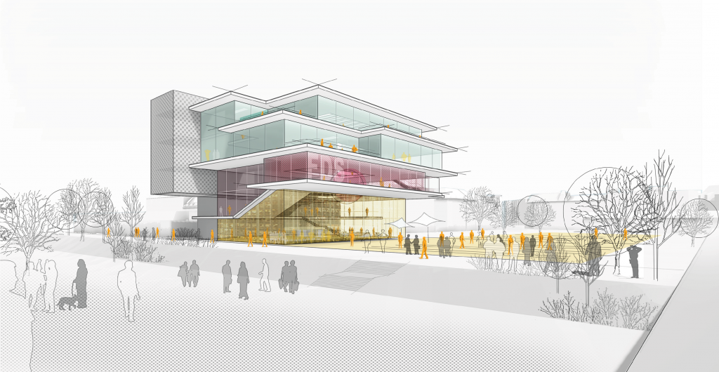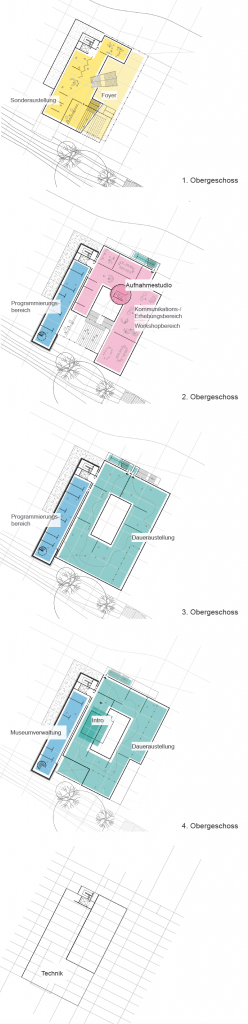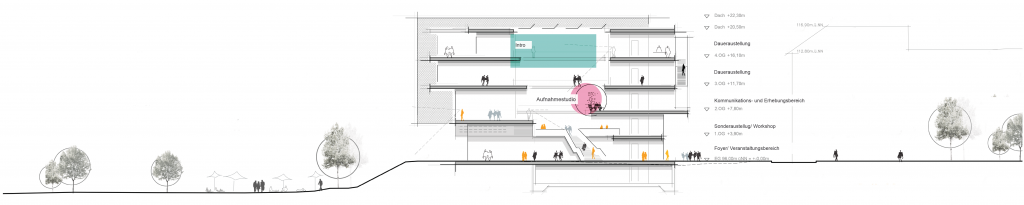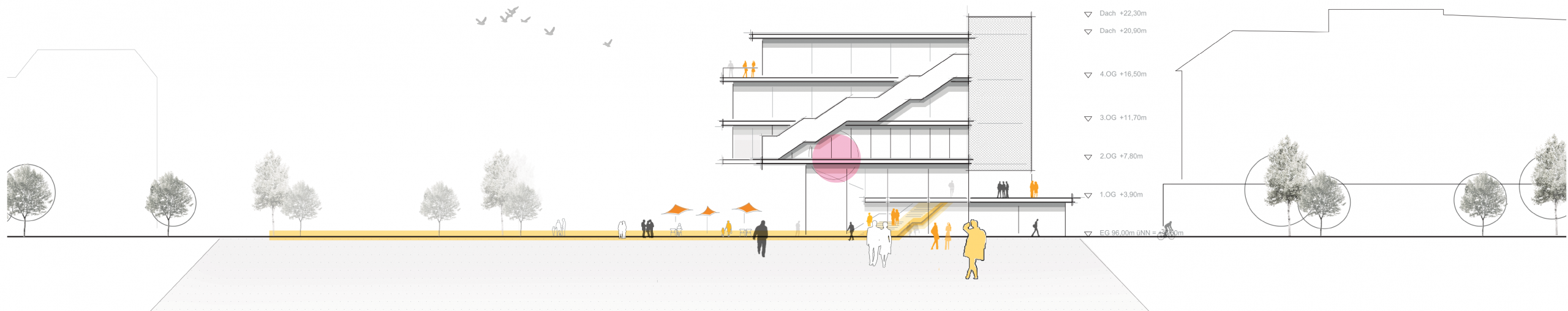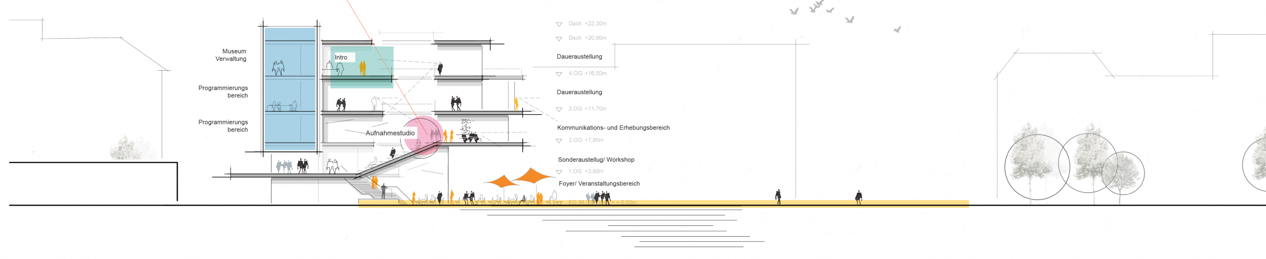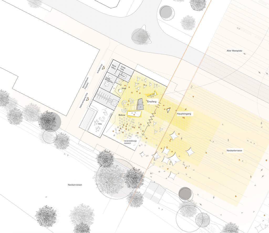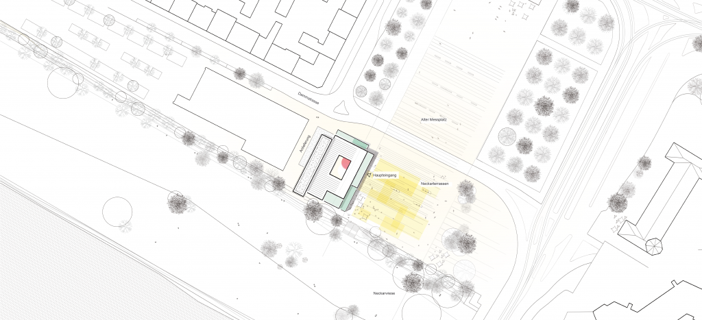Der Entwurf sieht ein transparentes, räumlich vernetztes Gebäude vor, das den Dialog zwischen Besucher*innen, Stadt und Wissenschaft fördert. Großzügige Sichtbezüge zum Neckar und zum neu gestalteten Platz schaffen Orientierung und verankern das Forum im urbanen Kontext.