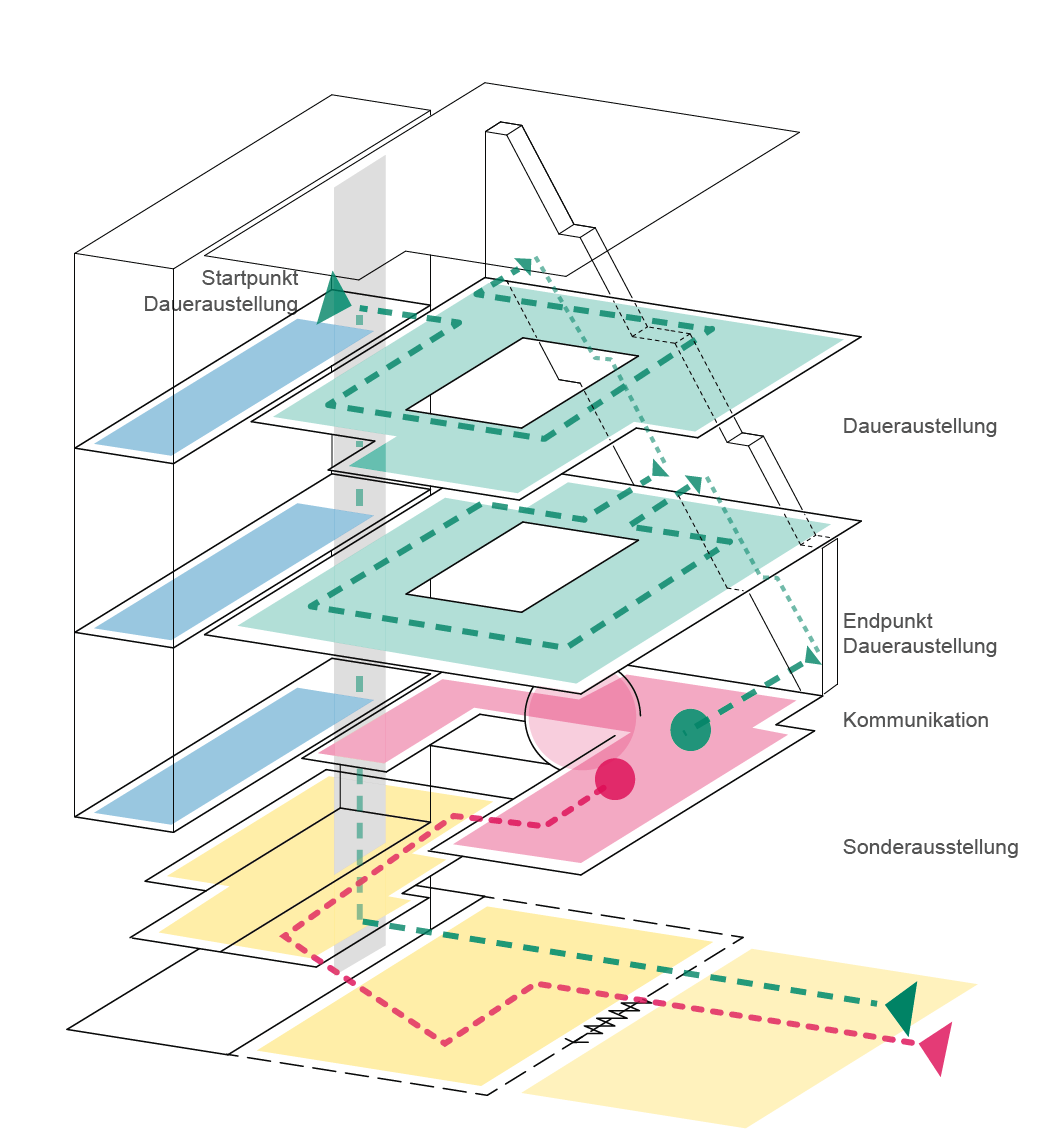 Die Architektur setzt auf Offenheit und Wandelbarkeit: ein räumliches Kontinuum aus Foyers, Galerien und Ausstellungsflächen, das Neugier und Entdeckerfreude weckt. Flexible Räume ermöglichen wechselnde Ausstellungsformate, Diskussionen und interaktive Erlebnisse rund um die deutsche Sprache.