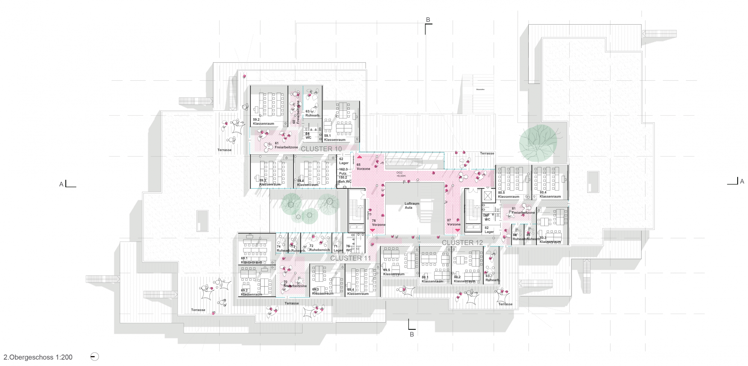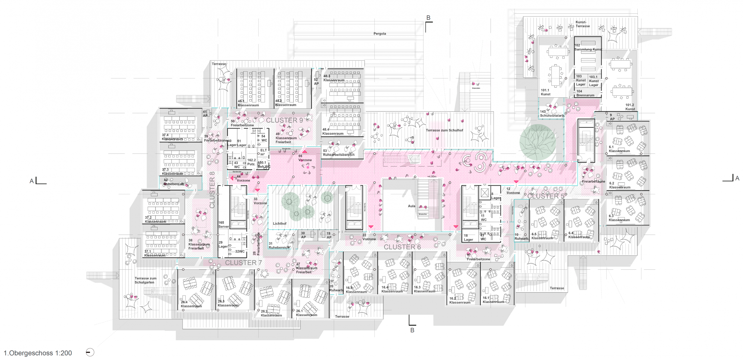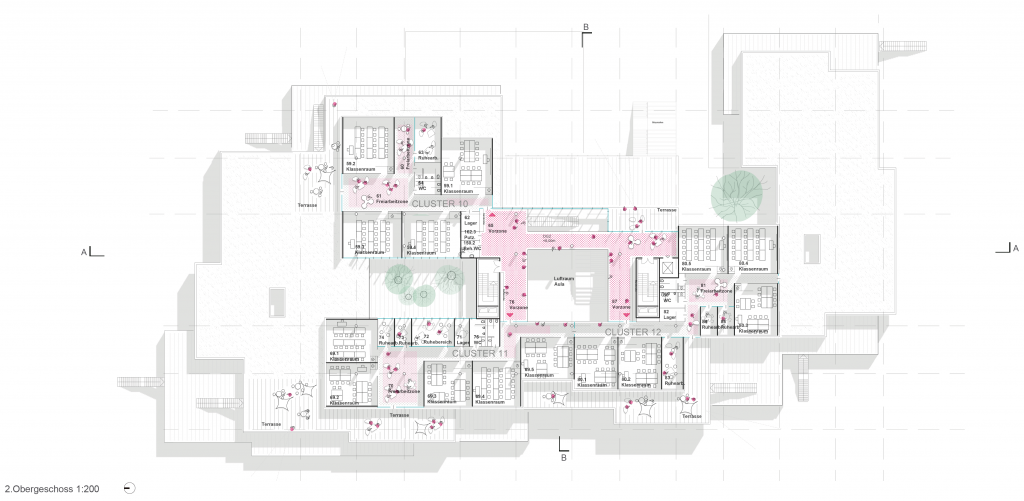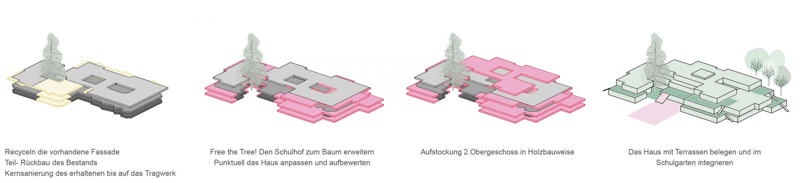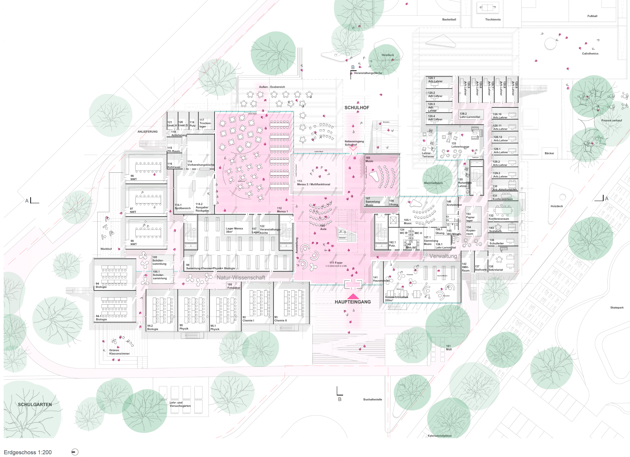 Der Entwurf reorganisiert und ergänzt den Bestand schrittweise, um den Schulbetrieb während der Bauphasen aufrechtzuerhalten. Bestehende Strukturen werden saniert, erweitert und flexibel neu interpretiert. Das zentrale Foyer mit Atrium bildet das Herz des Hauses – ein Ort des Ankommens, Austauschs und der Orientierung. Von hier aus entfalten sich transparente Verbindungen zu Aula, Mensa und Schulhof.