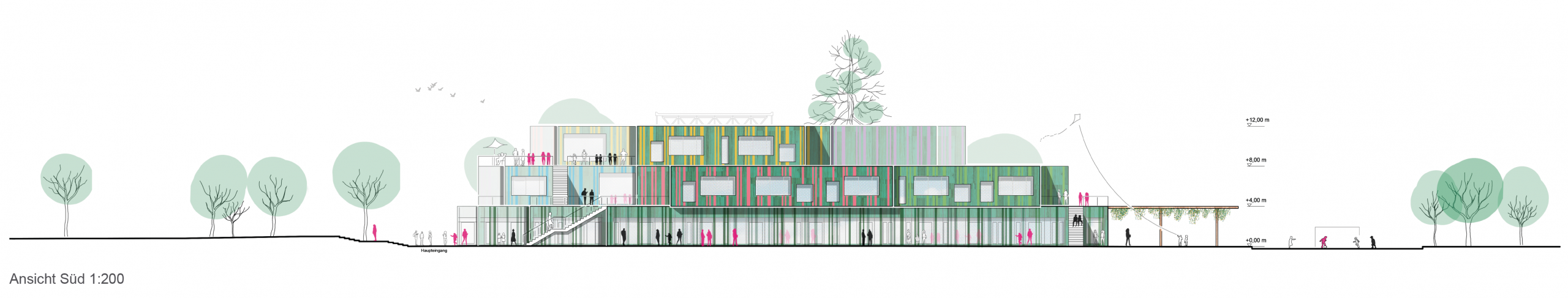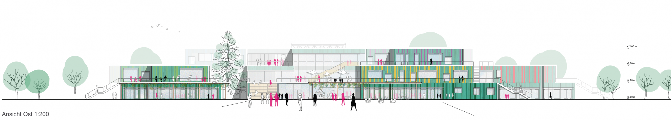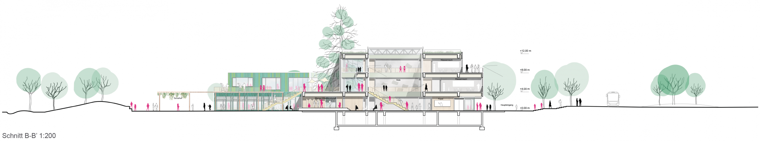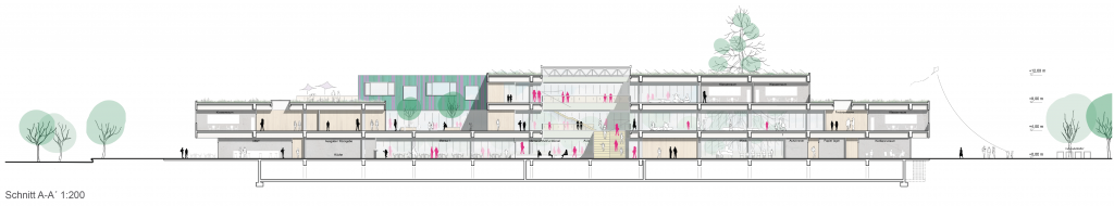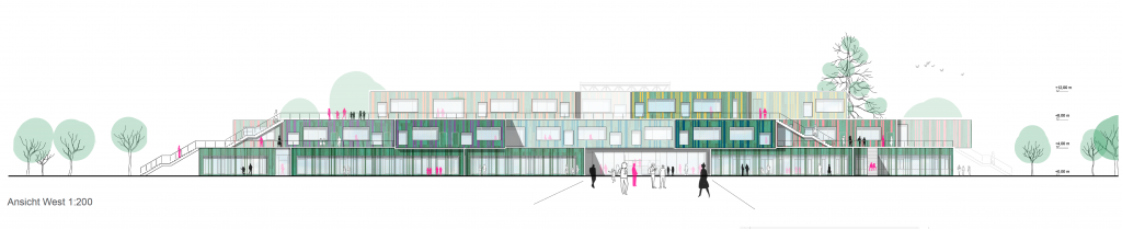 Die neue Architektur schafft wertvolle Lern- und Erlebnisräume, in denen Offenheit, Kommunikation und Gemeinschaft gefördert werden. Großzügige Freiflächen, begrünte Terrassen und geschützte Innenhöfe verknüpfen Innen- und Außenräume und bieten vielfältige Bezüge zur Natur.