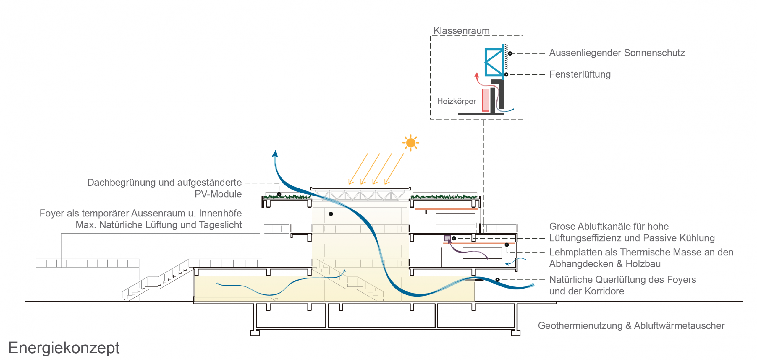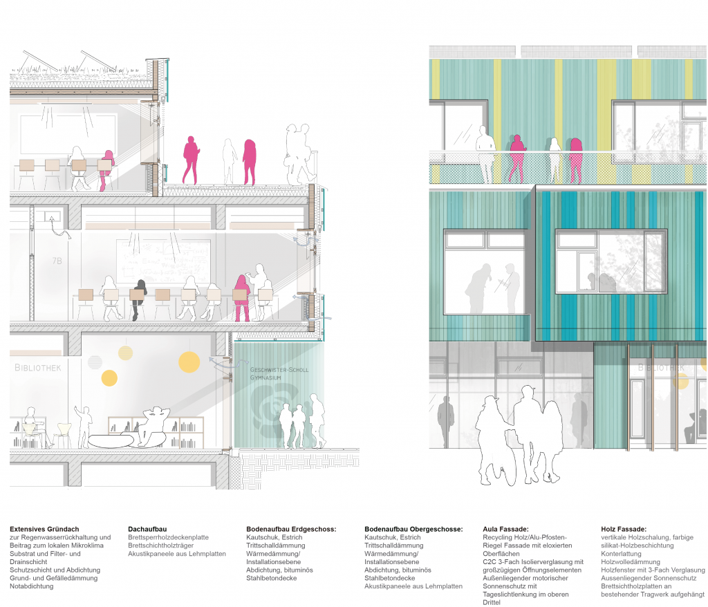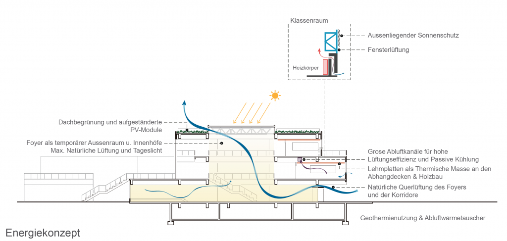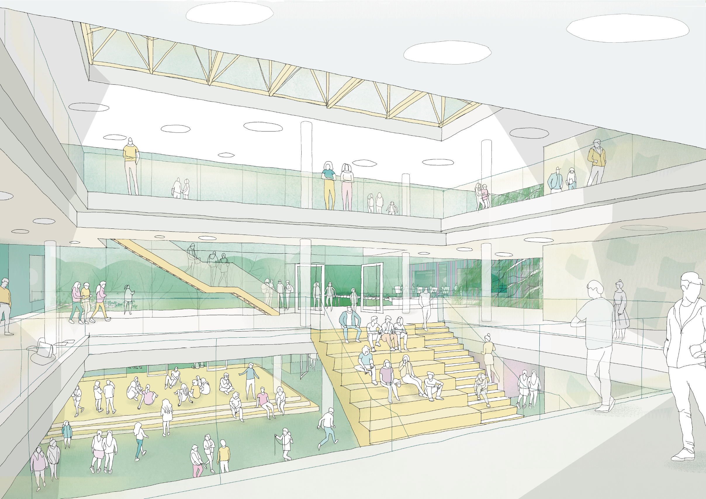 Die neue Architektur schafft wertvolle Lern- und Erlebnisräume, in denen Offenheit, Kommunikation und Gemeinschaft gefördert werden. Großzügige Freiflächen, begrünte Terrassen und geschützte Innenhöfe verknüpfen Innen- und Außenräume und bieten vielfältige Bezüge zur Natur.