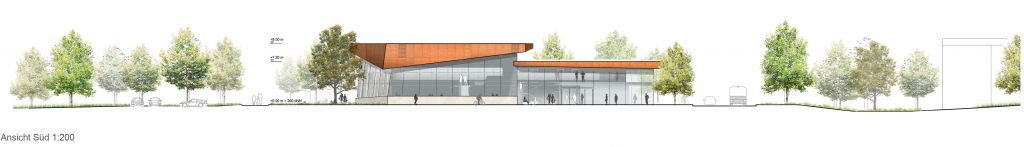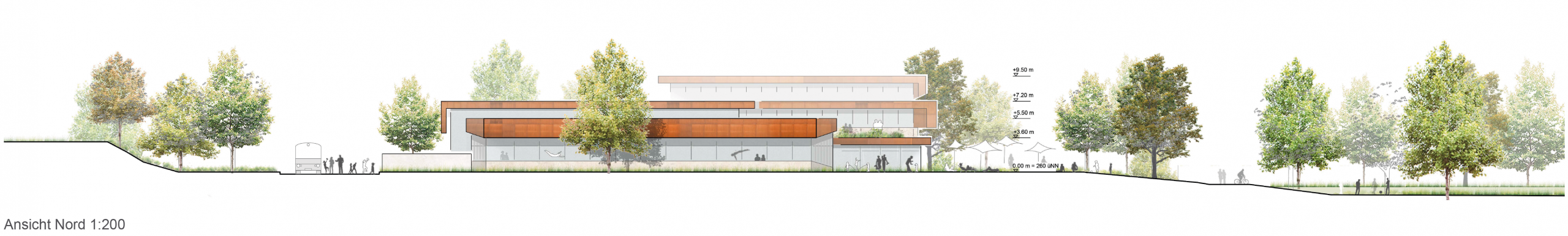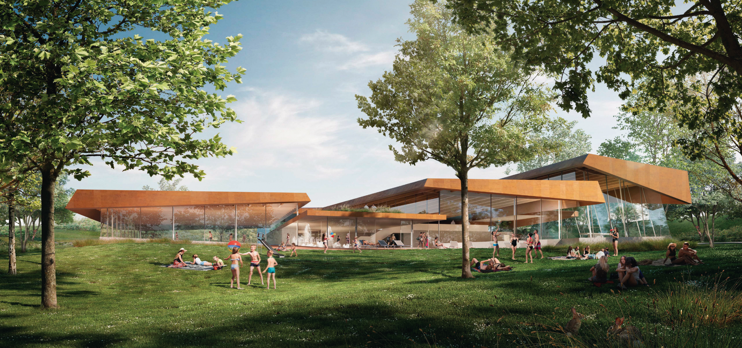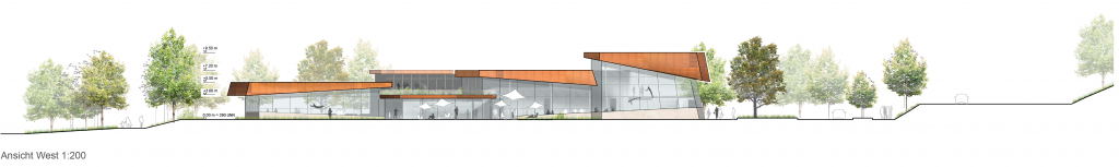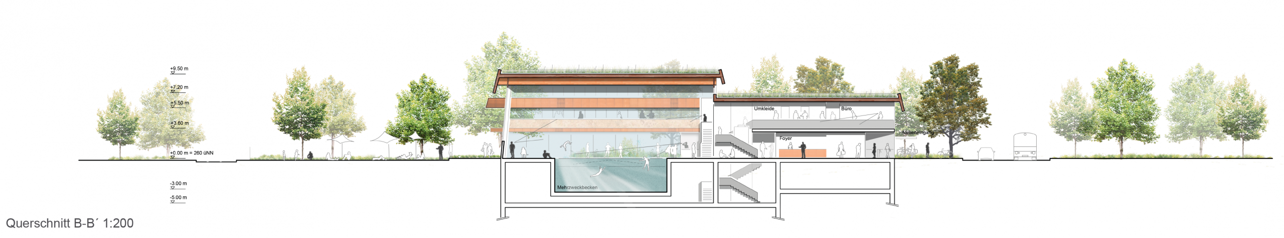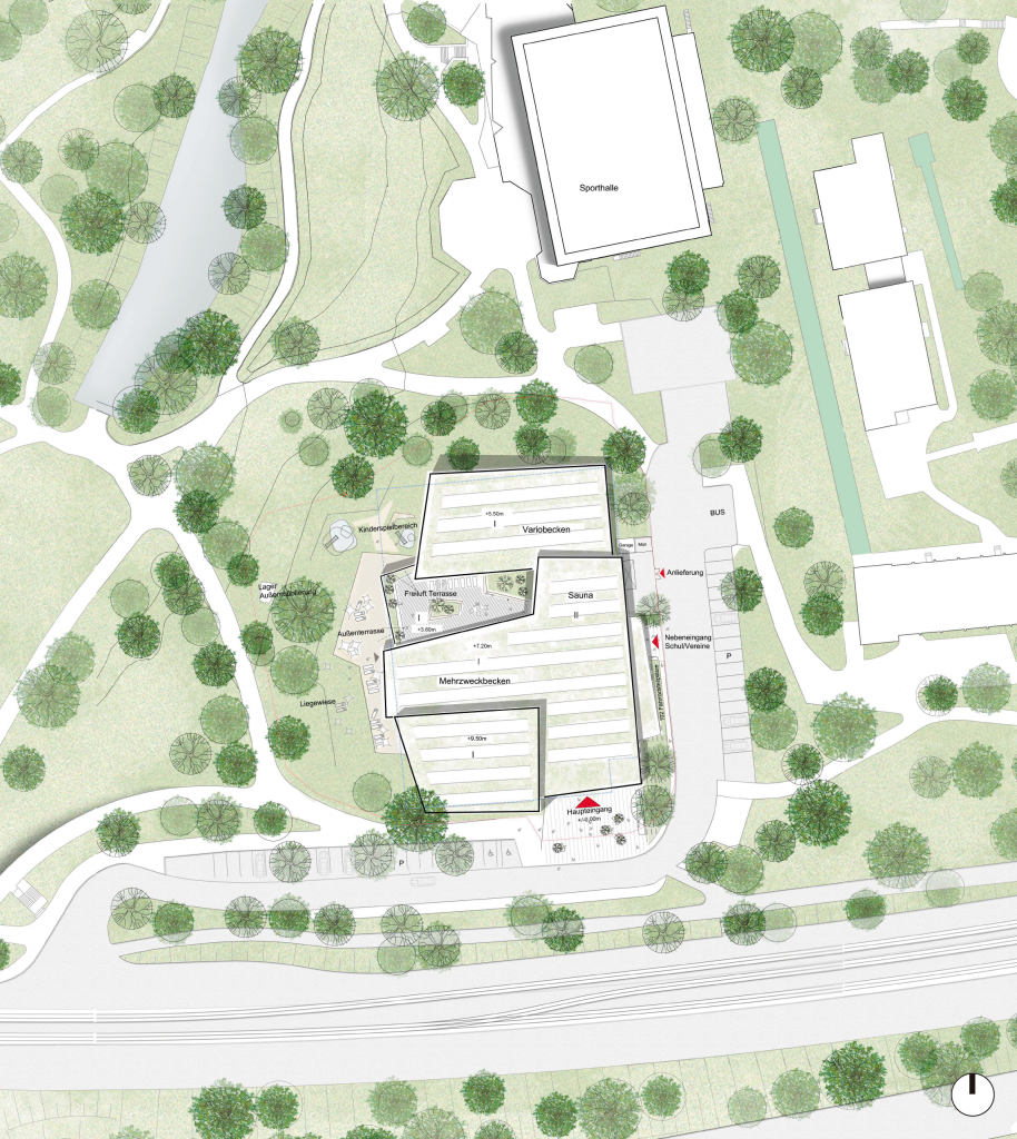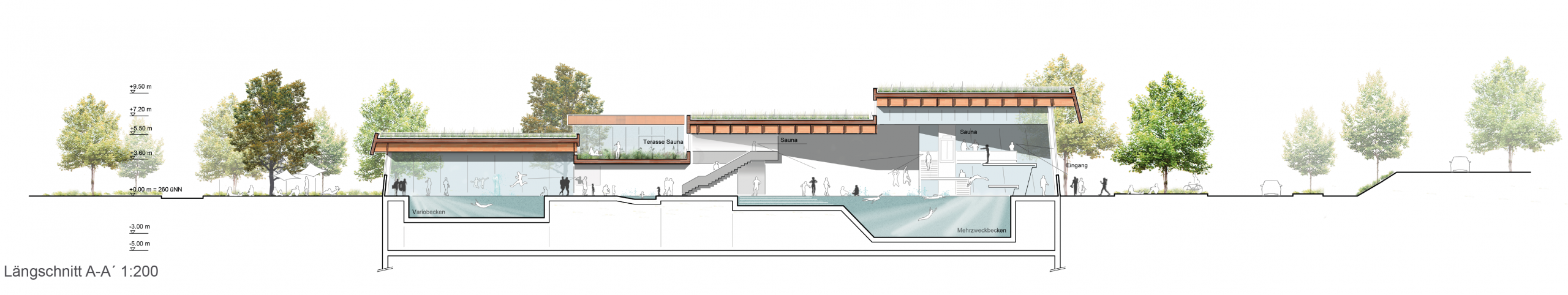 Architektonisch fügt sich das Gebäude harmonisch in die bestehende Topografie ein und bildet eine prägnante städtebauliche Adresse. Die klare Gliederung der Baukörper, das Wechselspiel von offenen und geschlossenen Flächen sowie die Einbindung der umgebenden Grünräume verleihen dem Bad eine lebendige und zugleich ruhige Atmosphäre.