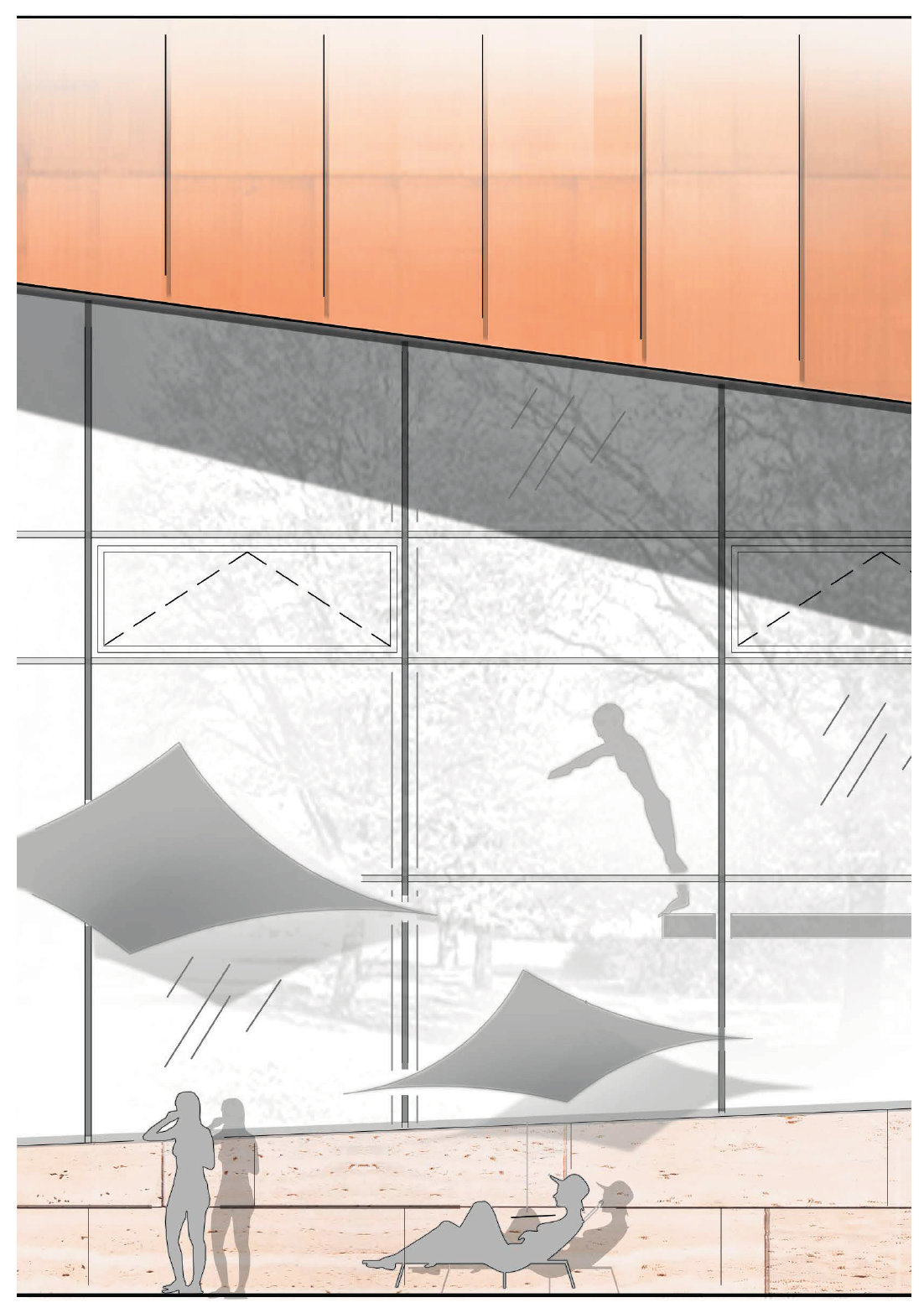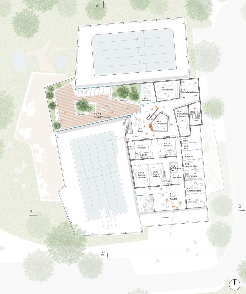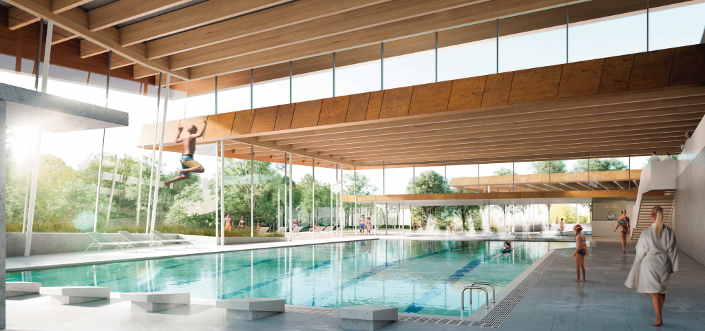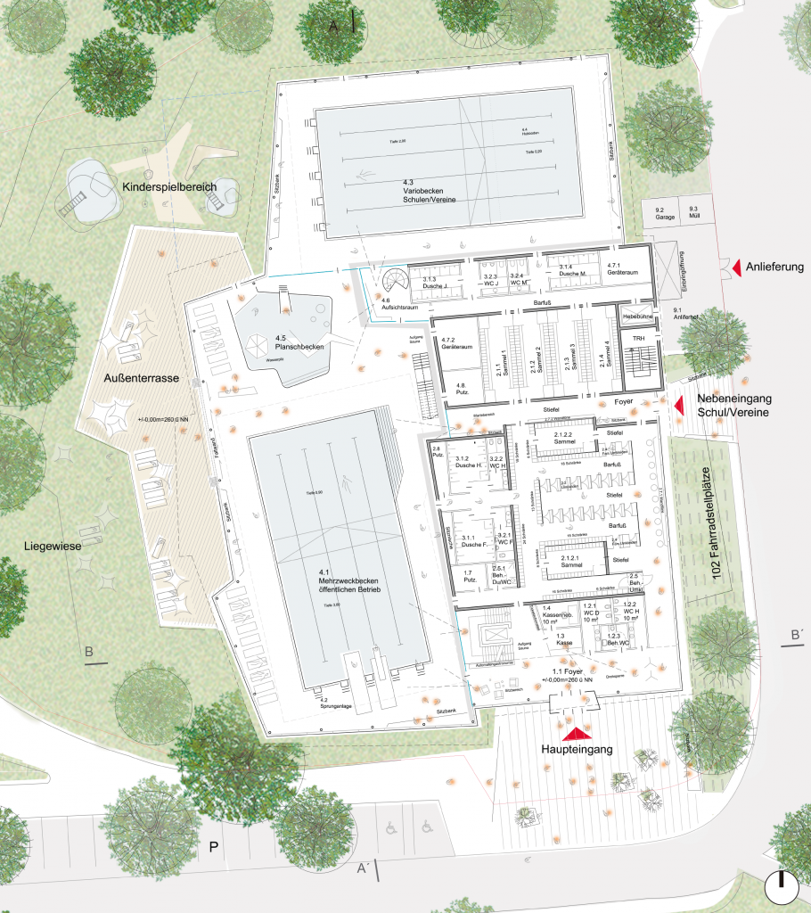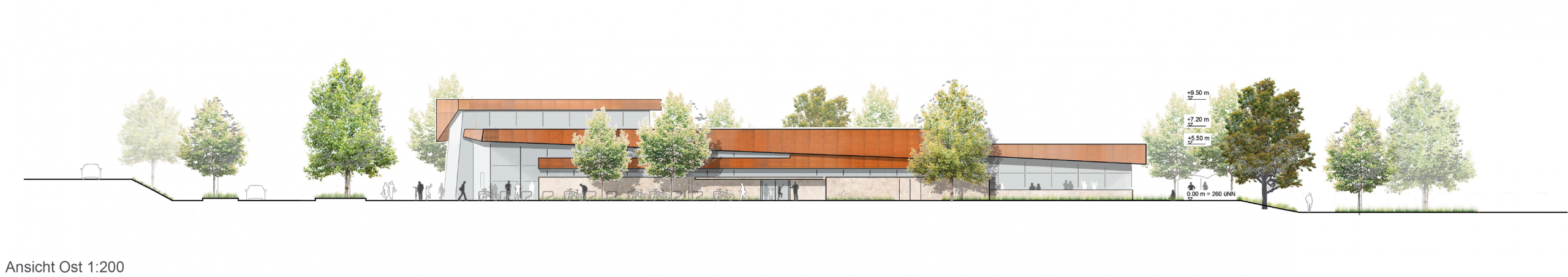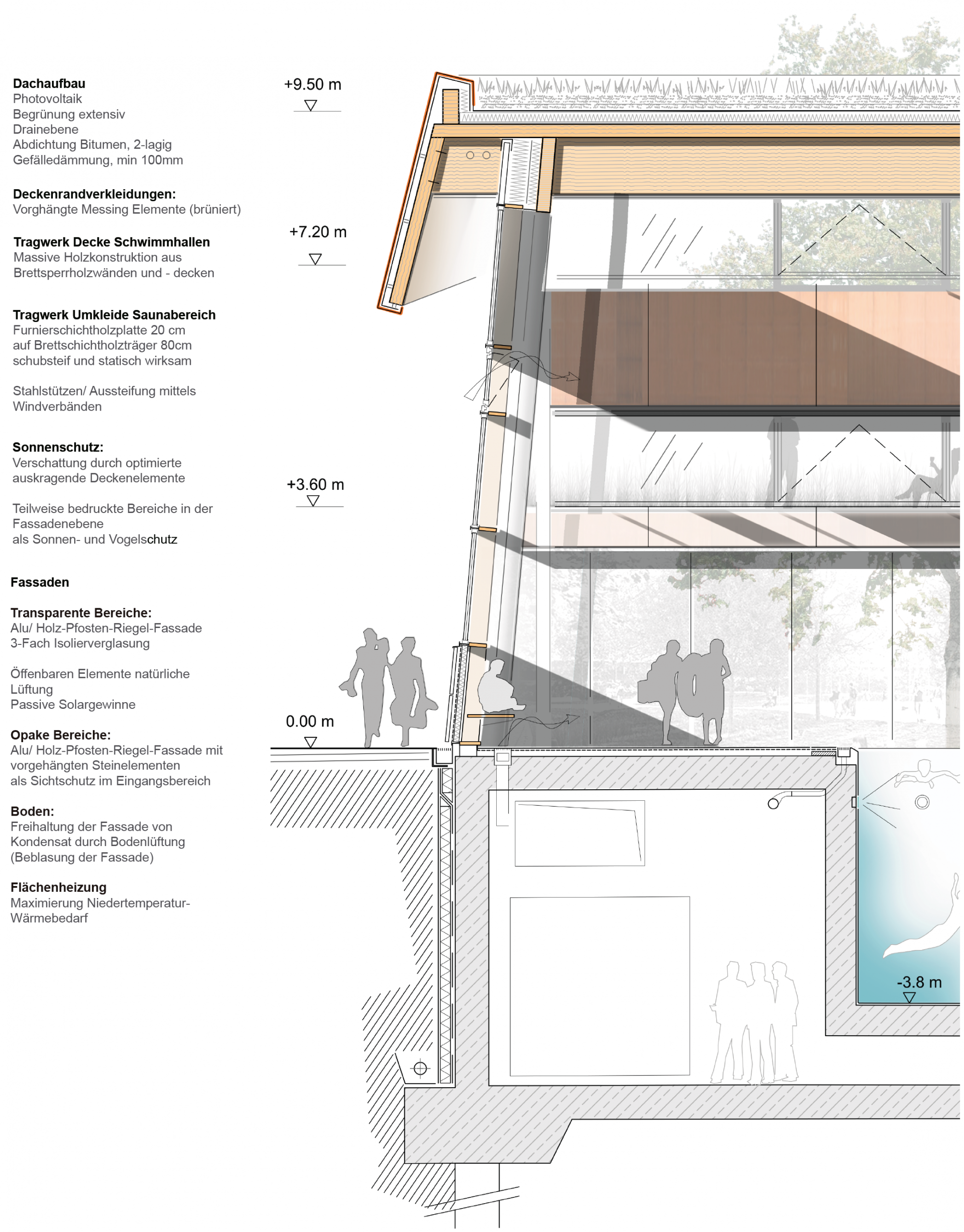 Architektonisch fügt sich das Gebäude harmonisch in die bestehende Topografie ein und bildet eine prägnante städtebauliche Adresse. Die klare Gliederung der Baukörper, das Wechselspiel von offenen und geschlossenen Flächen sowie die Einbindung der umgebenden Grünräume verleihen dem Bad eine lebendige und zugleich ruhige Atmosphäre.