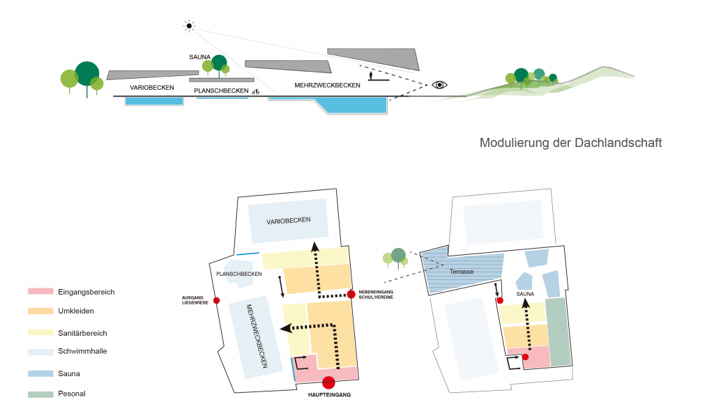 Die Anlage orientiert sich klar entlang der Haldenerstraße und öffnet sich mit einem einladenden Foyer zum Stadtraum. Transparente und helle Innenräume schaffen Übersicht und Orientierung. Neben dem öffentlichen Badebereich bietet das Haus separate Zugänge für Schulen und Vereine, eine Sauna mit Terrasse sowie großzügige Freiflächen.